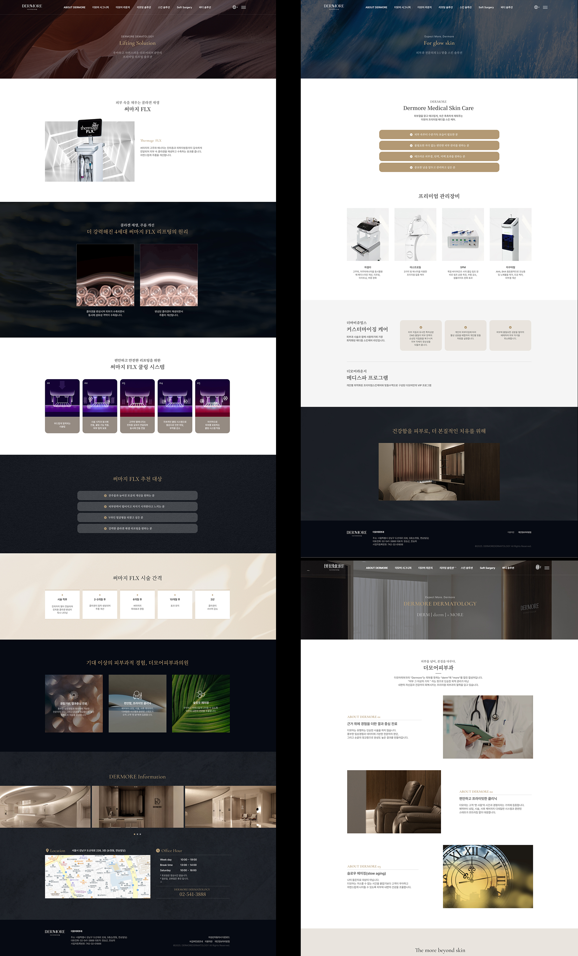 피부과 장비별로 사이트맵을 구성하고 서브페이지는 장점을 섹션별로 나열하여 사용자가 핵심 정보만 볼수있도록 하였습니다.
